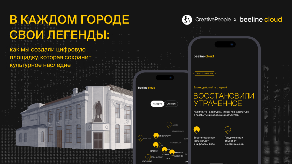 В 2023-ем году мы помогли beeline cloud с ребрендингом, и ключевой идеей коммуникации провайдера стала фраза «сохраняя самого ценное» — информацию. В этом году мы пошли дальше и развили вместе с клиентом эту идею в отдельный спецпроект «Городские легенды», который воссоздаёт утраченные памятники архитектуры и знаковые объекты в городах России.