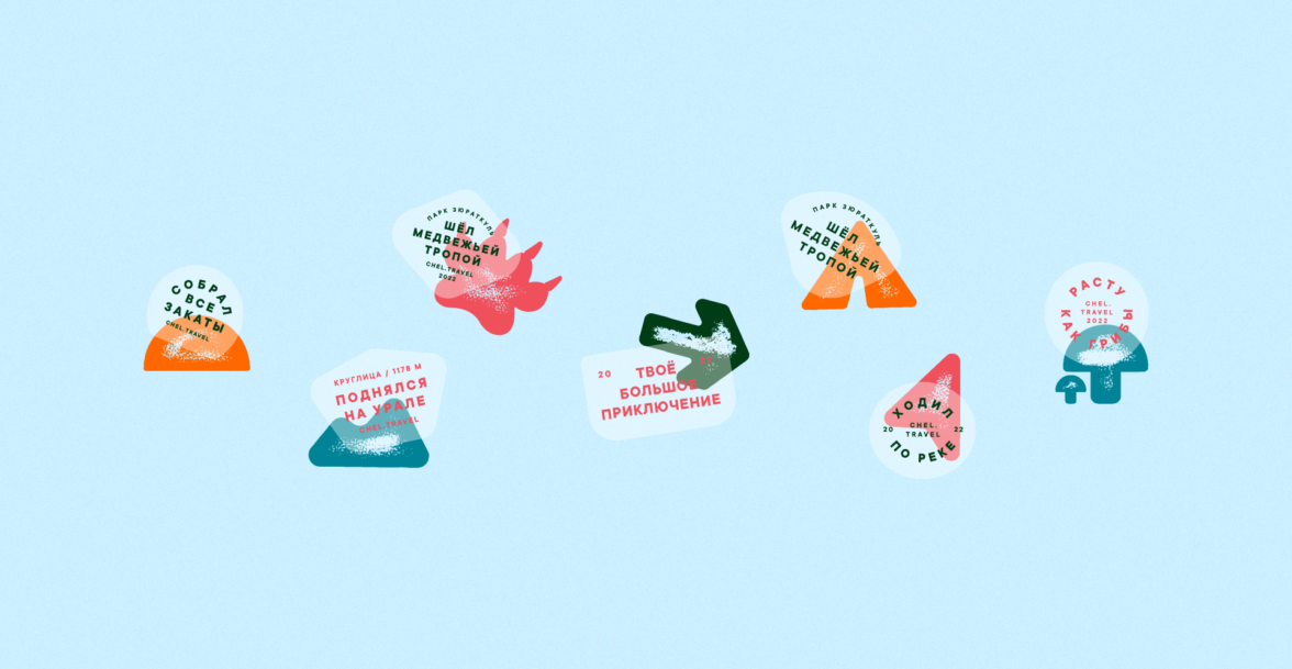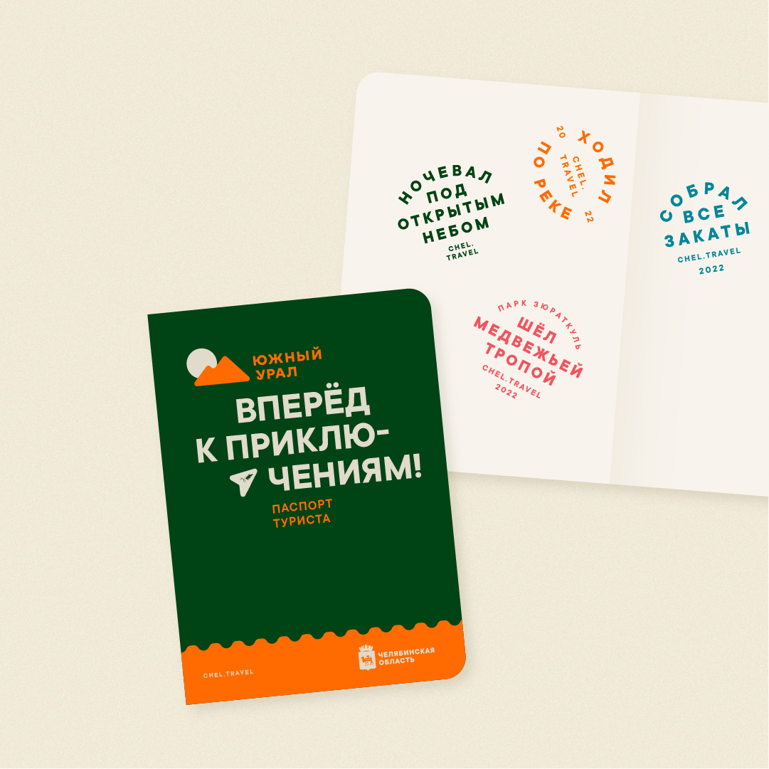 Интерактивные элементы. Как и положено всему, что связано с активным отдыхом, фирменный стиль становится функциональным. Он дополнен динамичными плашками и штампами.Волнистые плашки — это отсылка к горным хребтам и рекам Урала. Здесь можно разместить контакты, герб, информацию о месте. Плашки динамичны: поднимаются, переворачиваются или превращаются в марку с открытки.Фирменные штампы — элементы стиля, с которыми хочется взаимодействовать. Путешественник получает их за достижения, прохождение новых маршрутов и собирает в паспорт туриста.