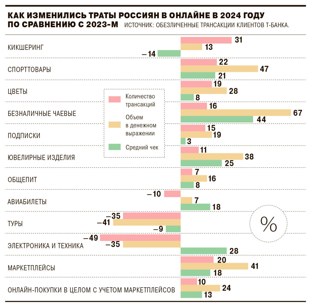 Согласно данным «Т-Кассы», самый большой рост онлайн-продаж в 2024 году среди товарных категорий показали спортивные товары, которые прибавили 47% год к году. Количество транзакций (покупок с пробитием чека) и средний чек в сегменте также выросли на 22% и 21% соответственно. На втором и третьем местах месте по росту объема интернет-продаж оказались ювелирные изделия и цветы (+38% и 28%).