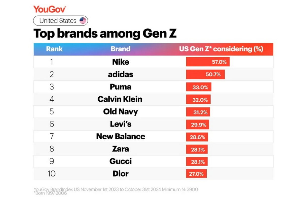 Рейтинг модных брендов, популярных у американской молодежи, поколения Z (1997–2012 годы рождения) заметно отличается от общего рейтинга. С одной стороны, Nike и Adidas, занявшие соответственно первую и вторую строчки в «зумерском» рейтинге, имеют более высокую поддержку, чем среди населения в целом. Товары этих брендов приняли бы в расчет при следующей покупке более половины зумеров. Nike — 57%, Adidas — 50,7%. При этом каждый третий зумер (33%) вспомнил бы про Puma. Этот бренд занял третье место, незначительно опередив Calvin Klein, за который проголосовали 32% молодых людей. Три последних строчки в «зумерском» Топ-10 заняли бренды, не попавшие в первую десятку в общем рейтинге. На восьмом-девятом — Zara и Gucci (по 28,1%), на десятом — Dior (27%).