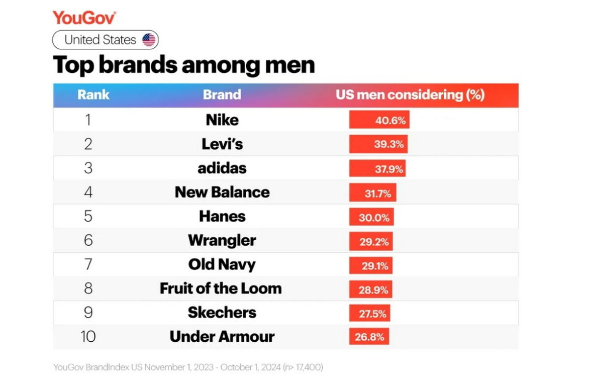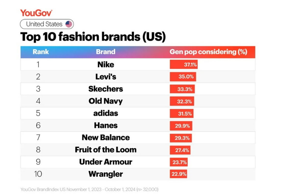 Конкуренция среди самых популярных в США брендов модной одежды оказалась очень высокой. Nike занял первое место в рейтинге, получив голоса 37,1% респондентов. Но он лишь на 2,1 процентных пункта опередил Levi`s, занявший второе место с 35% голосов. Levi`s, в свою очередь, обошел Skechers (третье место с 33,3% голосов) лишь на 1,7 процентных пункта. На четвертом месте — Old Navy (32,3% голосов), на пятом — Adidas (31,5%). В десятку также вошли (в порядке убывания): Hanes, New Balance, Fruit of the Loom, Under Armour и Wrangler. Как несложно заметить, американцы отдают явное предпочтение брендам спортивной одежды и обуви и джинсовой одежды.
