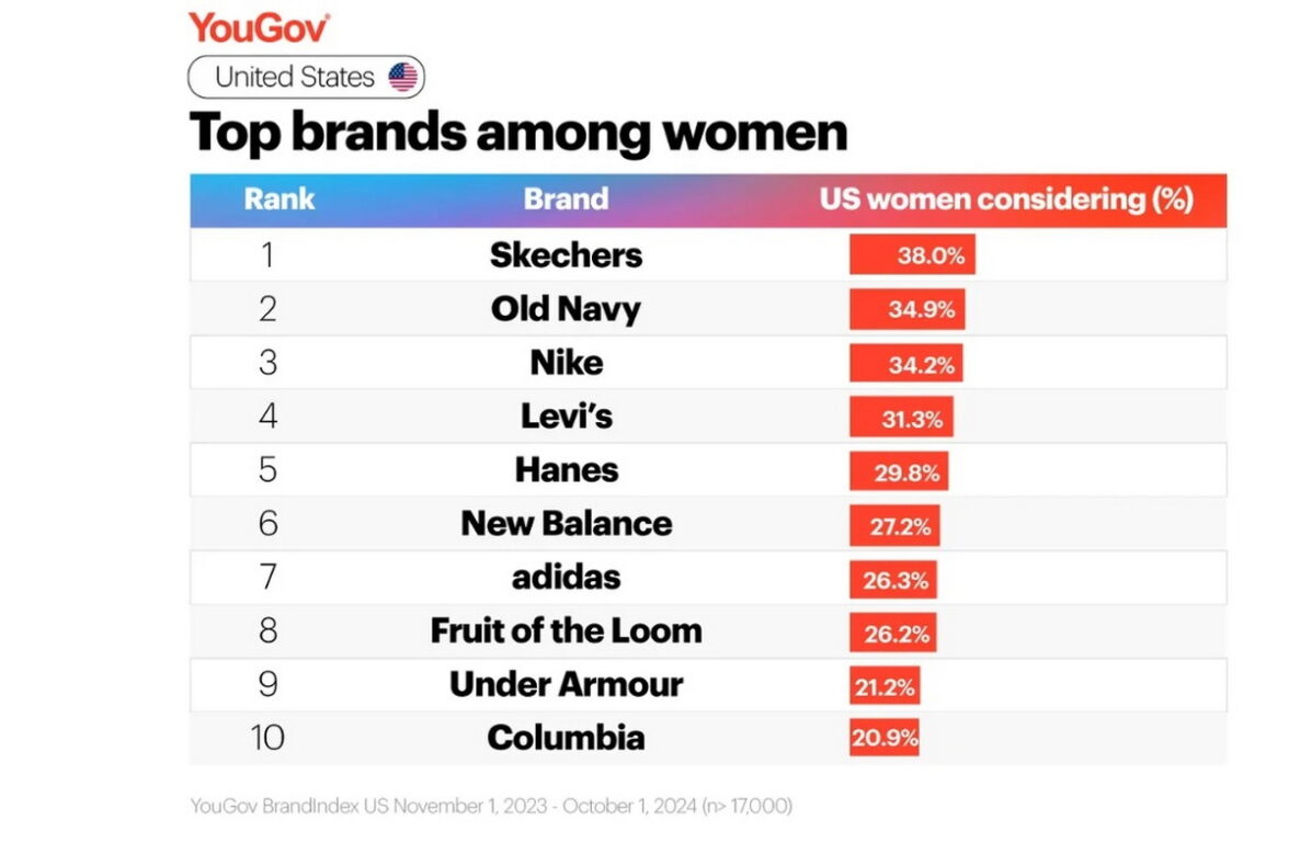 Женские вкусы больше отличаются от общеамериканских, чем мужские. Американки поставили на первое место среди брендов не Nike, а Skechers. За него проголосовали 38% женщин. На втором месте — Old Navy (34,9%). И только на третьем — Nike (34,2%).В «женский» рейтинг попал бренд, отсутствующий в общем рейтинге. Бренд Columbia занял 10-е место, получив поддержку 20,9% женщин. А вот Wrangler в женском варианте Топ-10 отсутствует.