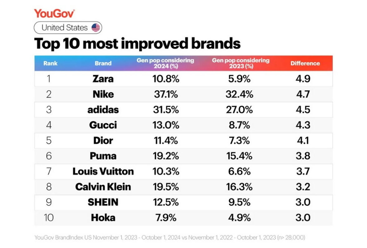 В сравнении с прошлым годом сильнее всего вырос уровень поддержки американцами бренда Zara — с 5,9% до 10,8%. У чемпиона и серебряного призера общего рейтинга, Nike и Adidas, также сильно прибавилось число поклонников. У Nike — с 32,4% до 37,1%, у Adidas — с 27% до 31,5%. Быстро росла популярность не попавших ни в одну Топ-10 Louis Vuitton, SHEIN и Hoka.