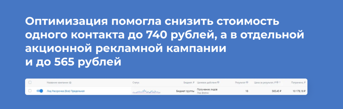 В дальнейшем оптимизация позволила уменьшить стоимость одного контакта до 740 рублей, а в рамках одной акционной кампании — даже до 565 рублей!