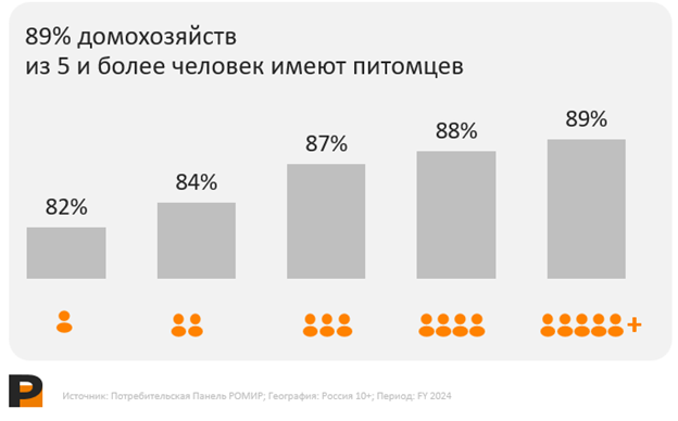 При этом в многочисленных семьях (5 и более человек) наблюдается наибольший процент тех, кто имеют дома питомца — 89%, в то время как среди тех, кто проживает в одиночку, заводят питомца 82%. Более того, прослеживается связь: чем больше людей в домохозяйстве, тем выше доля семей с домашними животными.