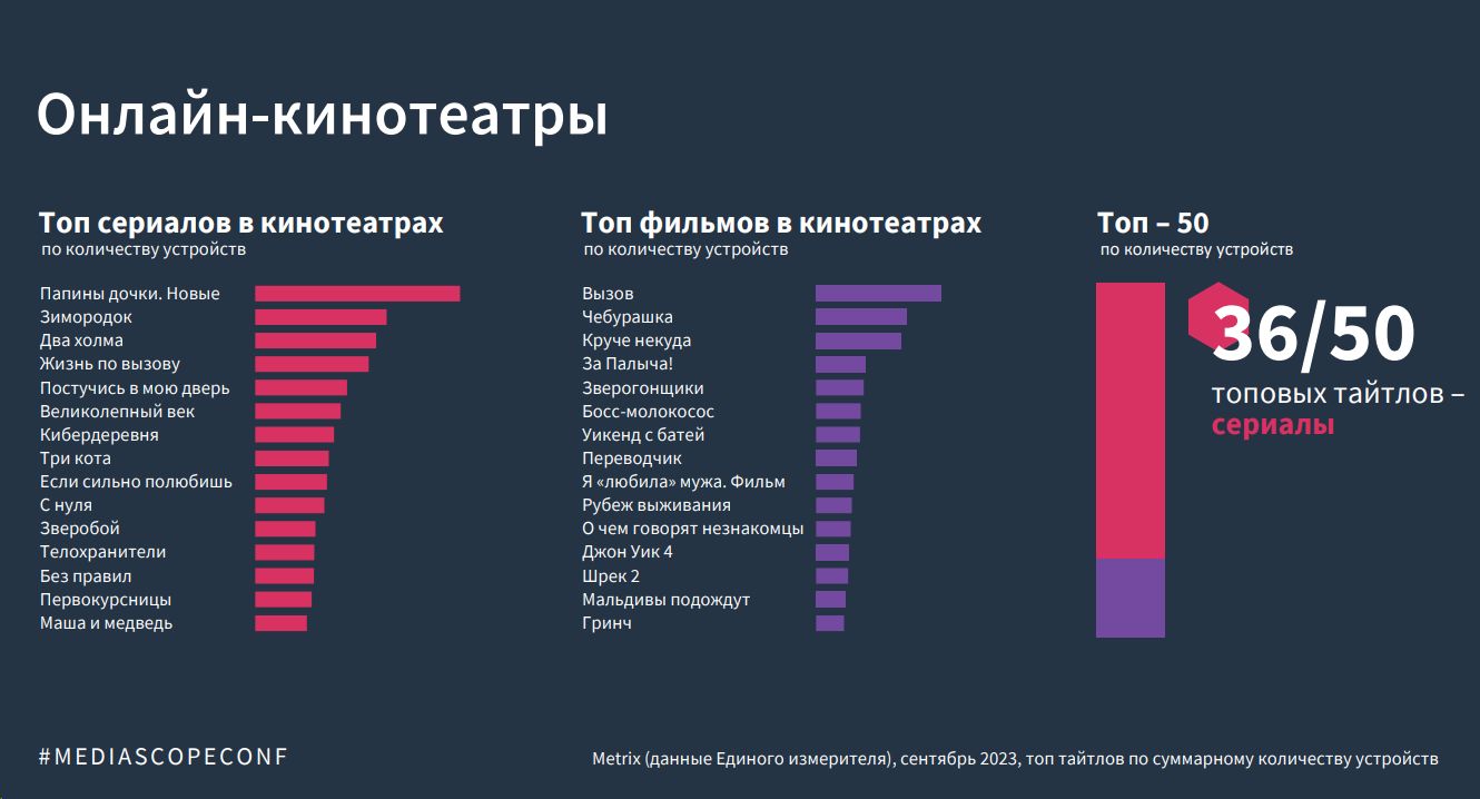 Самый популярным контентом онлайн-кинотеатров стали сериалы. На них пришлось 36 из 50 топовых тайтлов онлайн-кинотеатров в сентябре 2023 года.