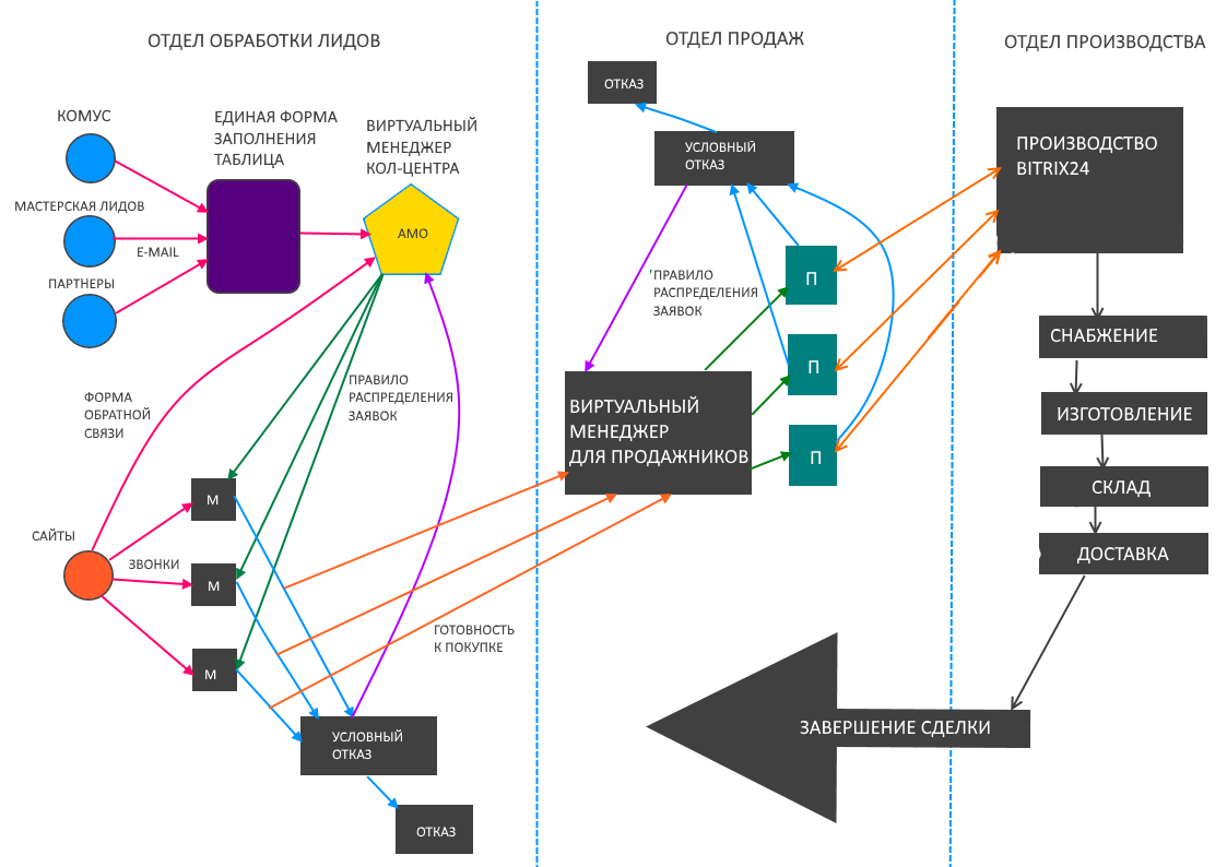 Внедрение CRM и интеграция с АТС. Мы решили выбрать amoCRM и интегрировать ее с Битрикс24, далее провести интеграцию с телефонией, а также с почтой, e-mail рассылкой и формой обратной связи, так как лиды приходят не только с лендингов путем звонков, но также и из других каналов. Попутно мы проанализировали бизнес-процессы компании и выделили еще несколько проблем, которые так же поможет решить CRM.