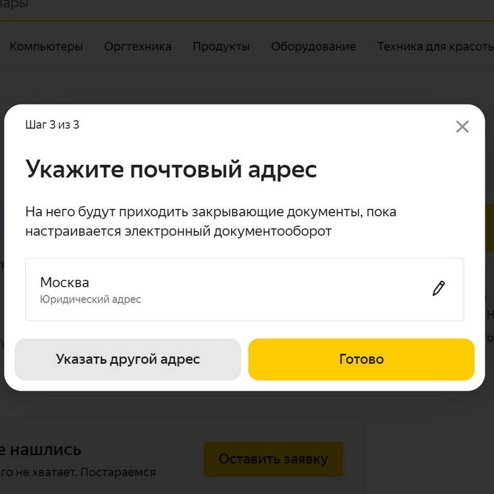 Заказать товары для юридического лица или индивидуального предпринимателя стало проще. Процедура регистрации в сервисе «Яндекс.Маркет для бизнеса» сведена к минимуму. Достаточно указать сервису ИНН организации или название компании. Необходимые для оформления документов данные маркетплейс загрузит сам. Для работы с сервисом можно выбрать электронный или бумажный документооборот. Нововведение «Яндекс.Маркета» сократит время регистрации бизнес-клиента с двух дней до нескольких минут.