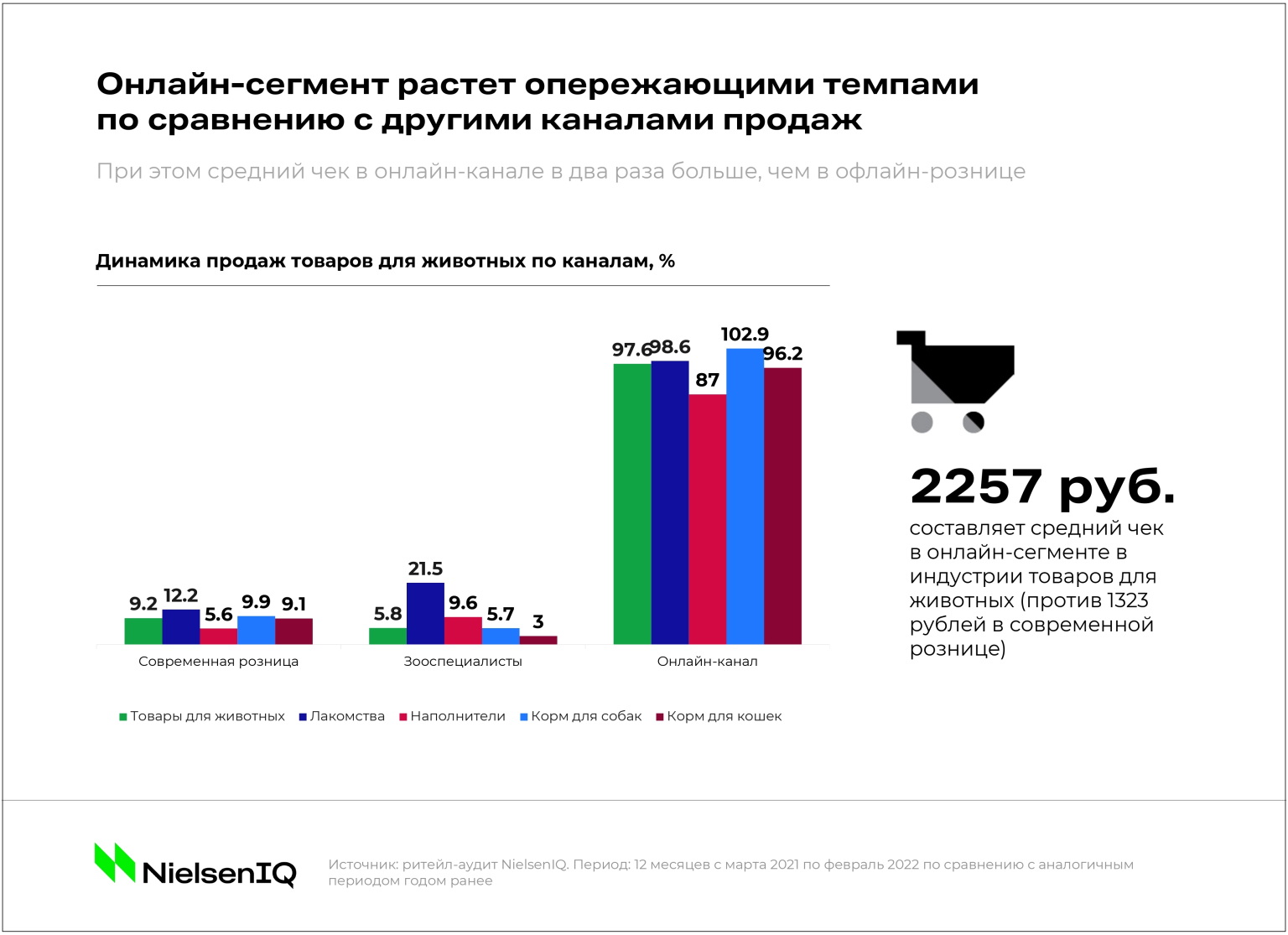 Доля онлайн-продаж товаров для домашних животных сейчас невелика. Но её рост относительно других каналов реализации более чем впечатляющий. За последний год он почти удвоился с 5 до 9% в денежном выражении. Темпы роста онлайн-продаж достигли почти 100% по сравнению с 9% в рознице и 6% в специализированных магазинах.