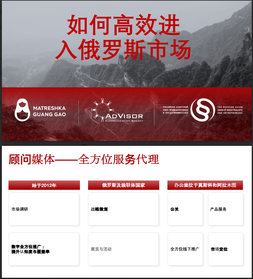 В начале года команда рекламного агентства AdVisor Media при поддержке Российско-азиатского союза промышленников и предпринимателей совместно с нашим китайским партнером, создали MGG (Matreshka Guang Gao) — первое российско-китайское рекламное агентство.