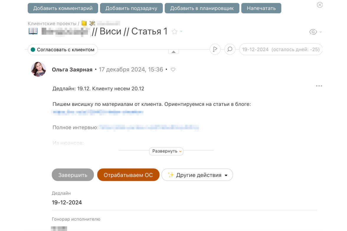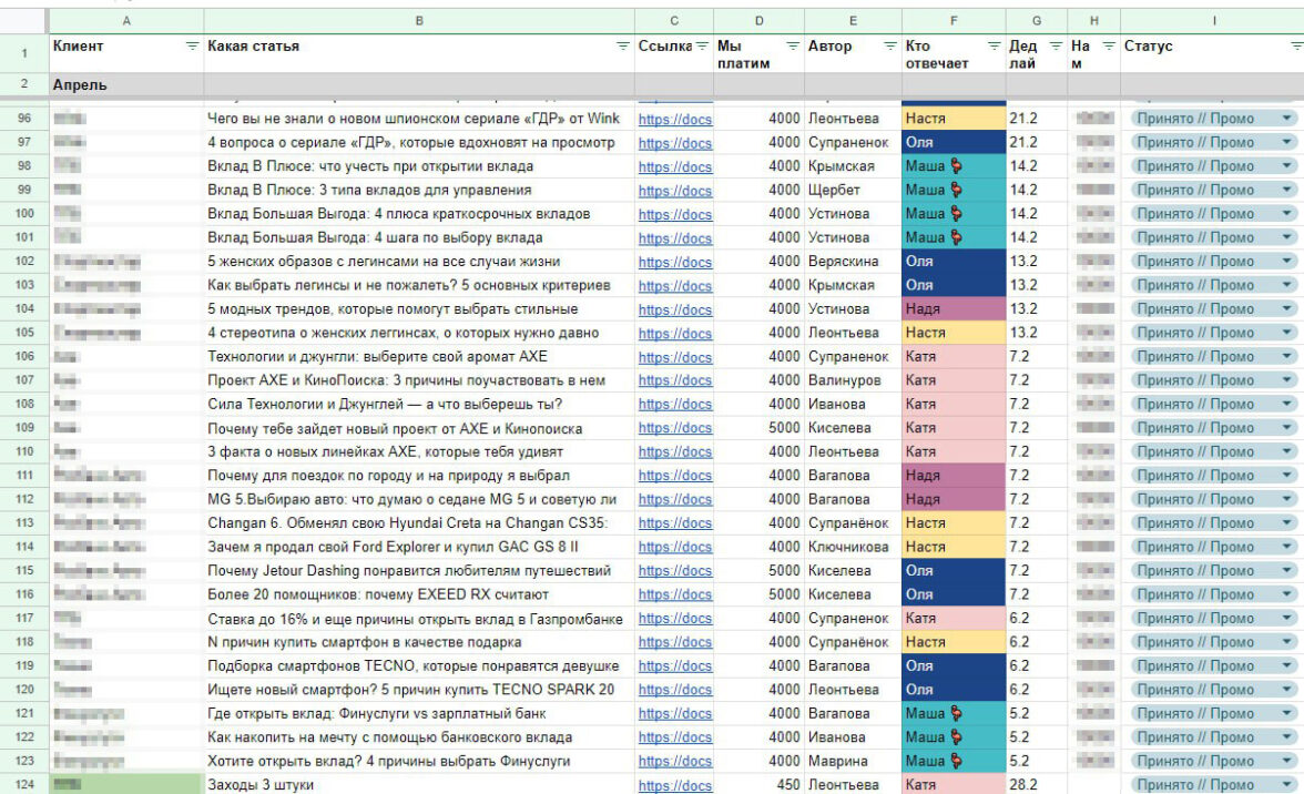 Стали контролировать клиентские проекты. В этом направлении у нас была куча проблем. Мы не вносили в таблицы работу по проекту и забывали ее выполнить, не соблюдали сроки, потому что нигде их не фиксировали. Самый треш — разные авторы и редакторы выполняли одну и ту же задачу. И все получали за это деньги.