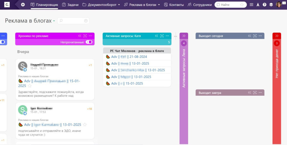 В ПланФиксе собраны данные по размещениям во всех каналах и блогах