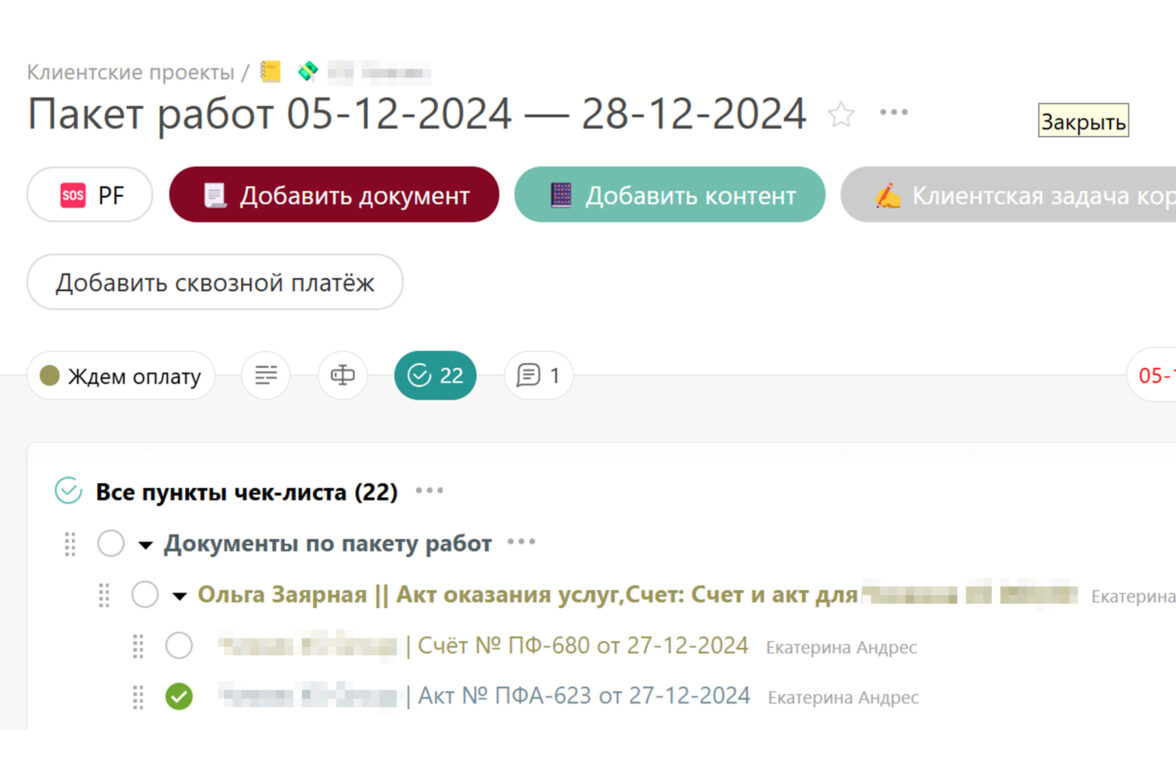 У каждого клиентского проекта есть пакет работ, в котором лежат все документы