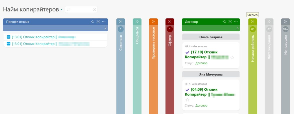 Воронки найма. Все отклики на вакансии агентства с разных каналов прилетают в систему, а сотрудники их разбирают. По каждому кандидату можно увидеть, до какого этапа найма персонала он дошел.