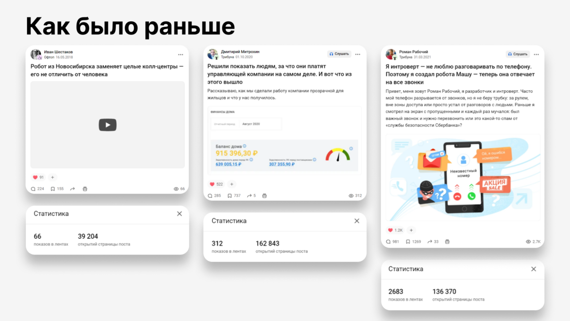 Теперь расскажу, какие результаты получаем на VC сейчас. Выбрал три случайные статьи — они написаны в подходящем для площадки формате и должны были бы набрать неплохое количество просмотров: