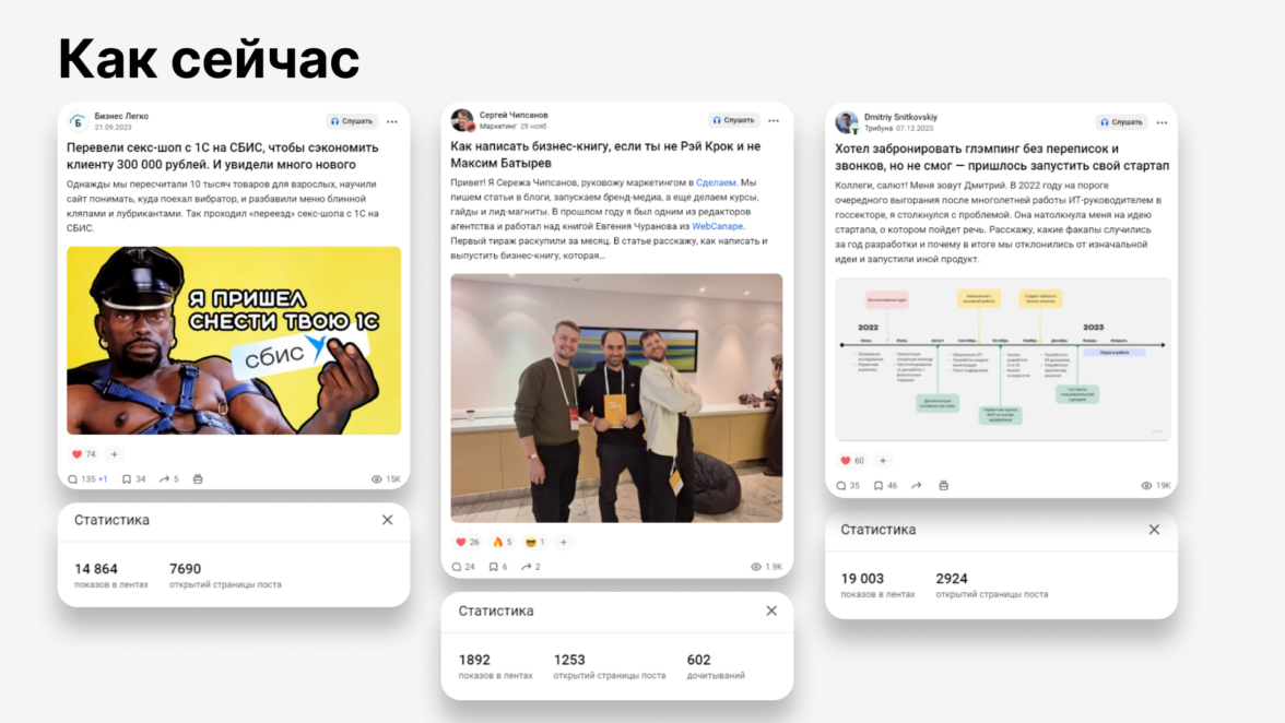 Перевели секс-шоп с 1С на СБИС, чтобы сэкономить клиенту 300 000 рублей. И увидели много нового. Тема про 1С и СБИС достаточно узкая, но мы подали ее так, чтобы было интересно всем — сделали цепляющую обложку, классный заголовок, интригующую подводку. Предположу, что если бы статья вышла в 2020–2021 году, набрала бы не меньше 160 000 прочтений. По факту мы получили 7700 открытий.