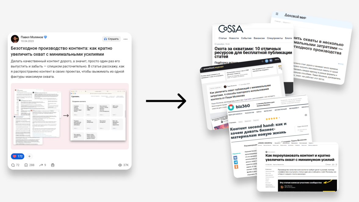 Например, у нас была статья на VC про безотходное производство контента. Она набрала 11 000 просмотров и 288 сохранений. Это ок, но хочется больше. Поэтому мы решили отнести статью на другие площадки. Где-то слегка поменяли текст, а где-то использовали только часть исходной фактуры и дописывали остальное с учетом специфики СМИ. Но в любом случае на пять публикаций мы потратили намного меньше усилий, чем если бы писали с нуля.