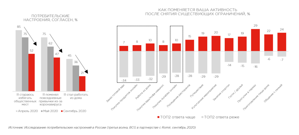 В конце III квартала 2020 года более 30% населения были готовы отказаться от дистанционных покупок продуктов питания. Трафик начал возвращаться в магазины: если в апреле посещение упало на 80%, то в сентябре это отклонение было уже на уровне 16% (согласно данным Watcom). Казалось, что электронная коммерция – это временное решение.