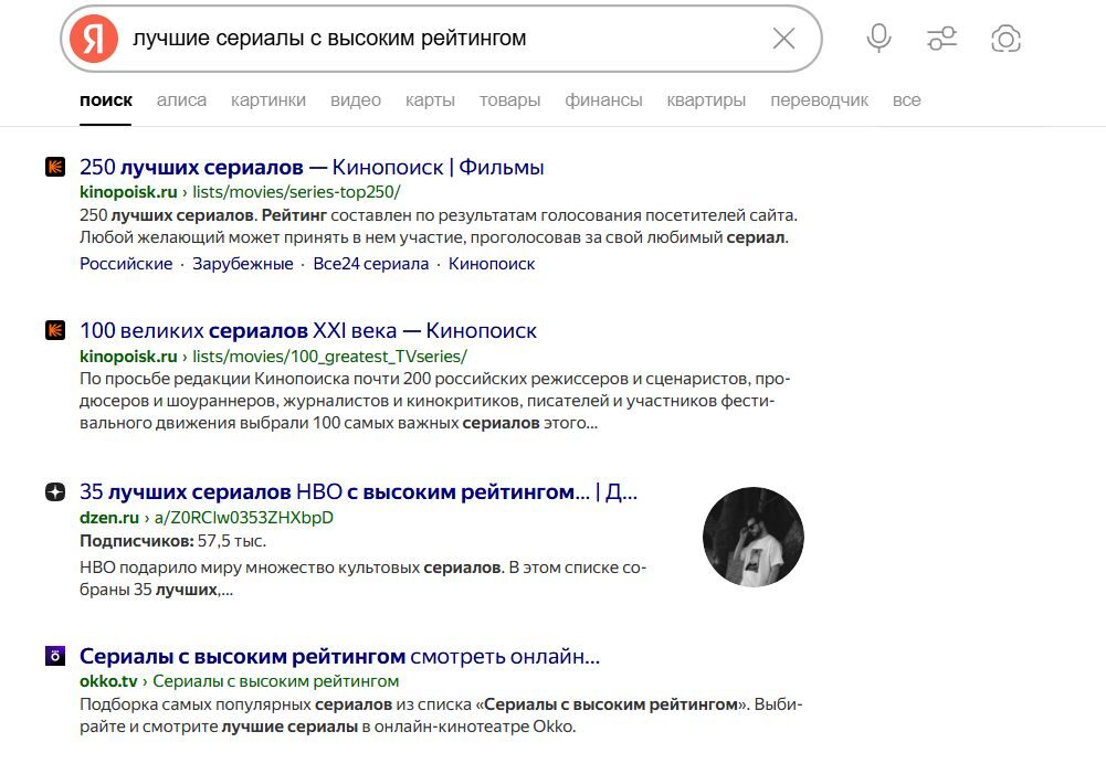 Пример выдачи Яндекса по запросу «Лучшие сериалы с высоким рейтингом»