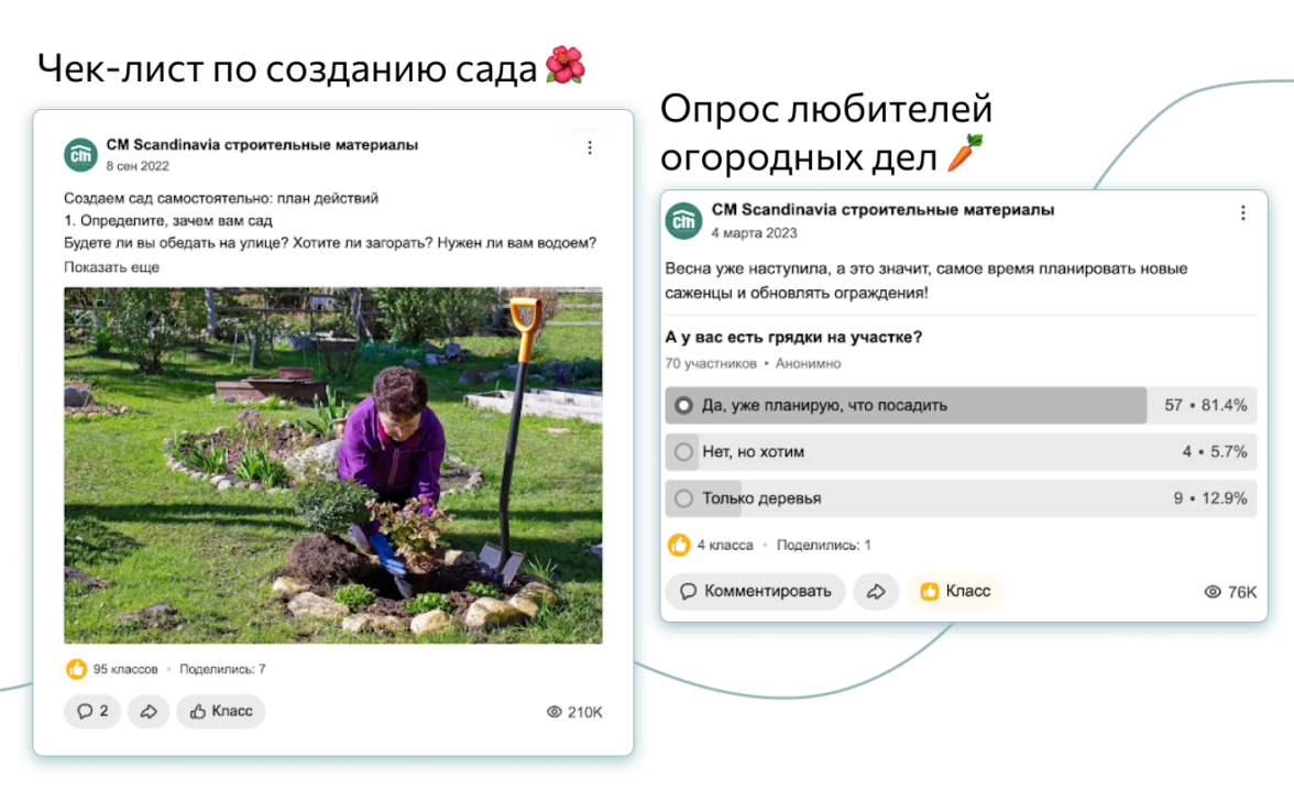 Сад и благоустройство дома — это тема, которая идеально пересекается с идеей бренда о создании уютного пространства в своем доме. Но что еще важнее, эта тема входит в топ интересов аудитории ОК (дачников) и транслирует самое важное — любовь к загородной жизни.