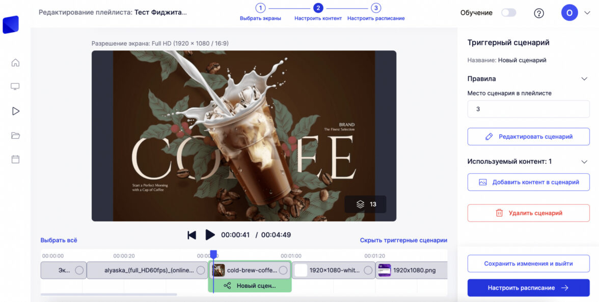 После настройки система не требует ручного управления — рекламные материалы переключаются в плейлисте автоматически при совпадении условий в каждой из локаций, с указанными правилами (триггерными сценариями).
