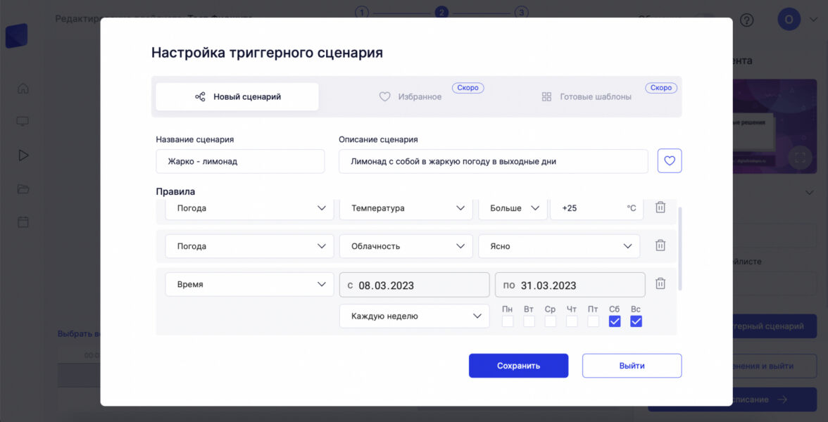 В редакторе к каждому слайду с креативом можно задать уникальные условия отображения — температуру воздуха, осадки облачность, дату и день недели.