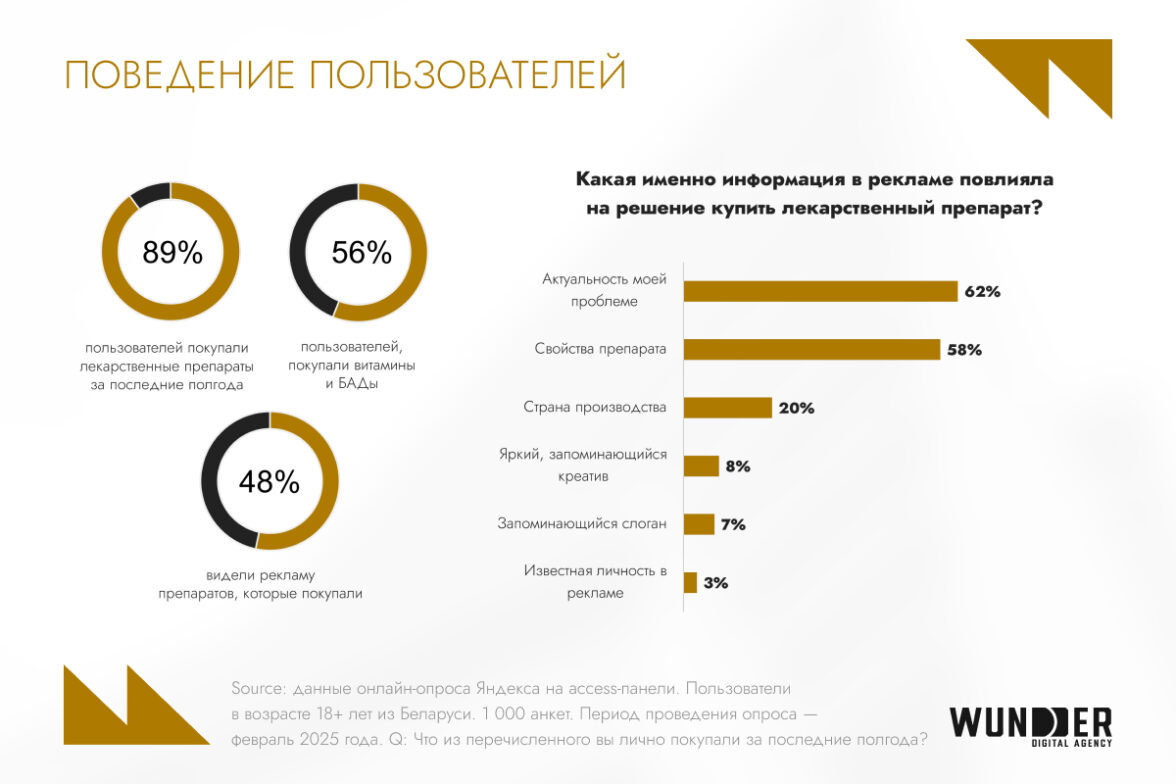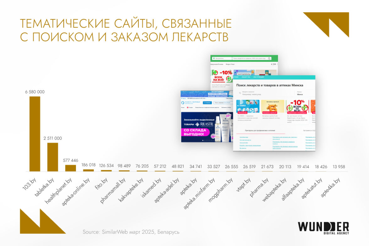 Все заметнее становится тренд на онлайн-покупки: около 30% пользователей готовы заказывать лекарства, витамины и БАДы в интернете. Для них важны прежде всего цена, возможность сравнивать предложения и удобство оформления. В этом плане особую роль играют тематические площадки 103.by и tabletka.by. Здесь пользователи не только выбирают препараты, но и активно сопоставляют аптеки и условия покупки.