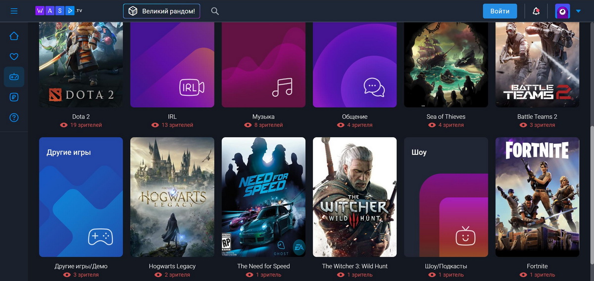 Корреспондент ADPASS, желая поближе познакомиться с работой WASD, зашел на сайт платформы. Количество зрителей стримов говорит сам за себя. Так, стрим одной из самых главный киберспортивных игр DOTA 2 смотрели 19 зрителей, Hogwarts Legacy — 2 зрителя, а Fortnite — 1 зритель.