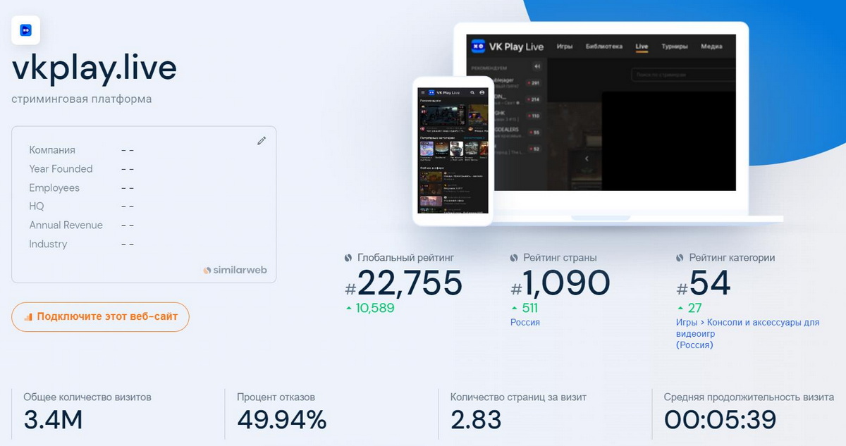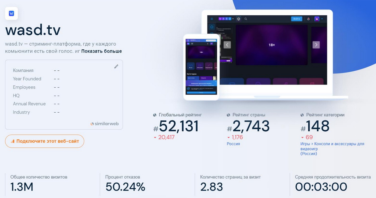 По данным SimilarWeb, главный мировой сервис игрового стриминга Twitch.tv по посещаемости занимает 69 строчку в топ-100 сайтов, популярных у россиян. Платформа WASD находится на 2743 месте странового рейтинга, а VK Play Live обосновался на 1090 месте.