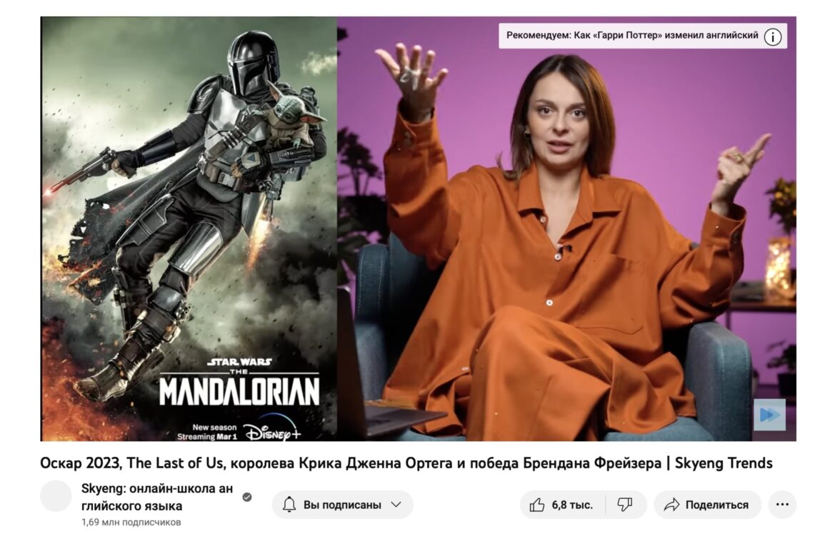 Особенно удачный проект Skyeng — это нескучный английский, где харизматичная ведущая блогер Таня Старикова разбирает слова из новостей, киноновинок и песен. В каждый ролик добавляется реклама школы.