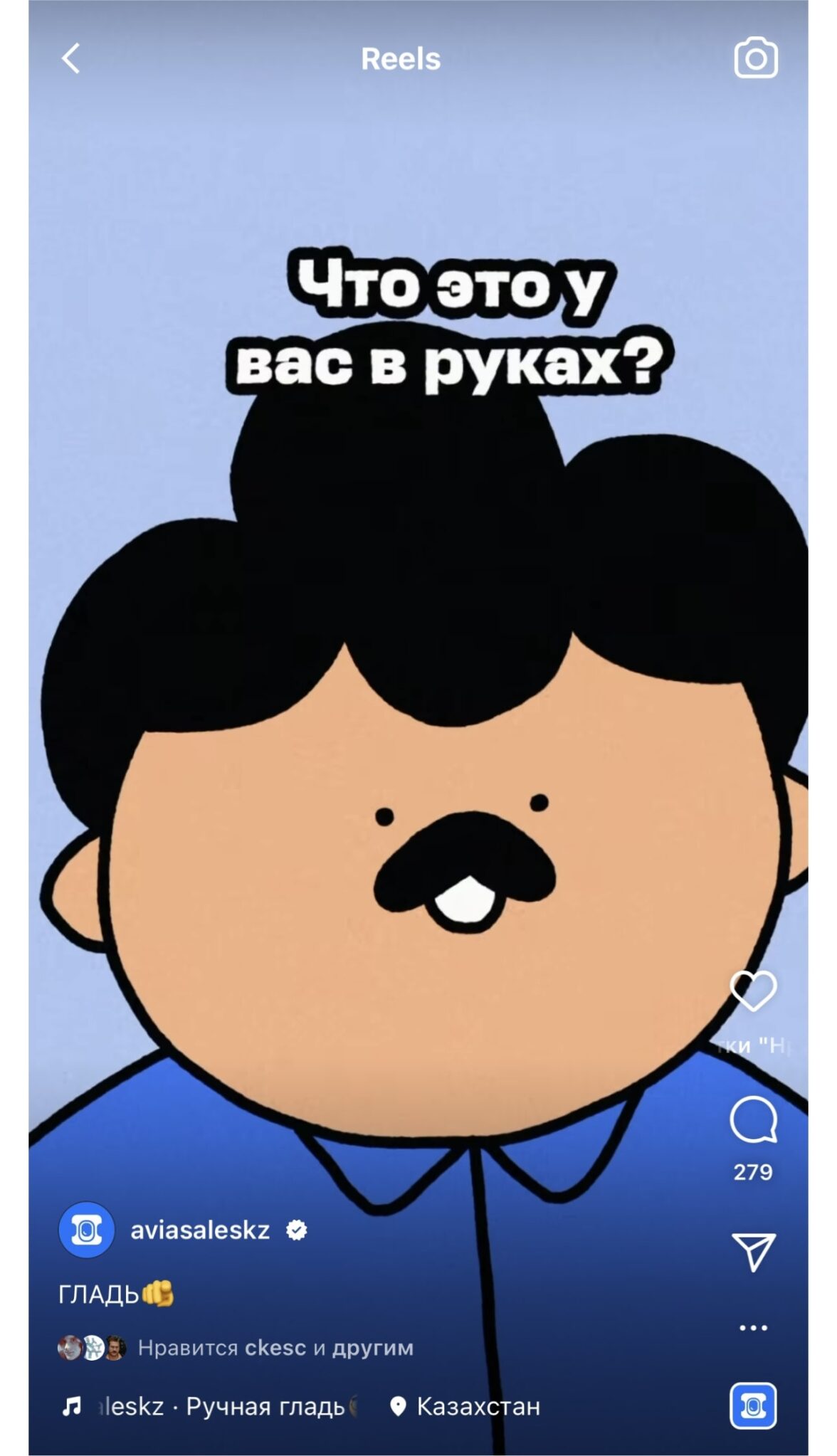 Аккаунт Instagram* Aviasales Казахстан набрал миллионы просмотров за счёт юмористических роликов с нарисованным персонажам и адаптации мемов. Герой каждый раз пытается вставить в сюжет интеграцию: «Aviasales — поиск дешёвых авиабилетов». Это ролики, которыми хочется делиться с друзьями из-за их смелого и абсурдного юмора. Одним из таких стало видео про ручную кладь, которое набрало 4,6 миллионов просмотров и само стало мемом: пользователи начали использовать аудиодорожку для своих Reels.