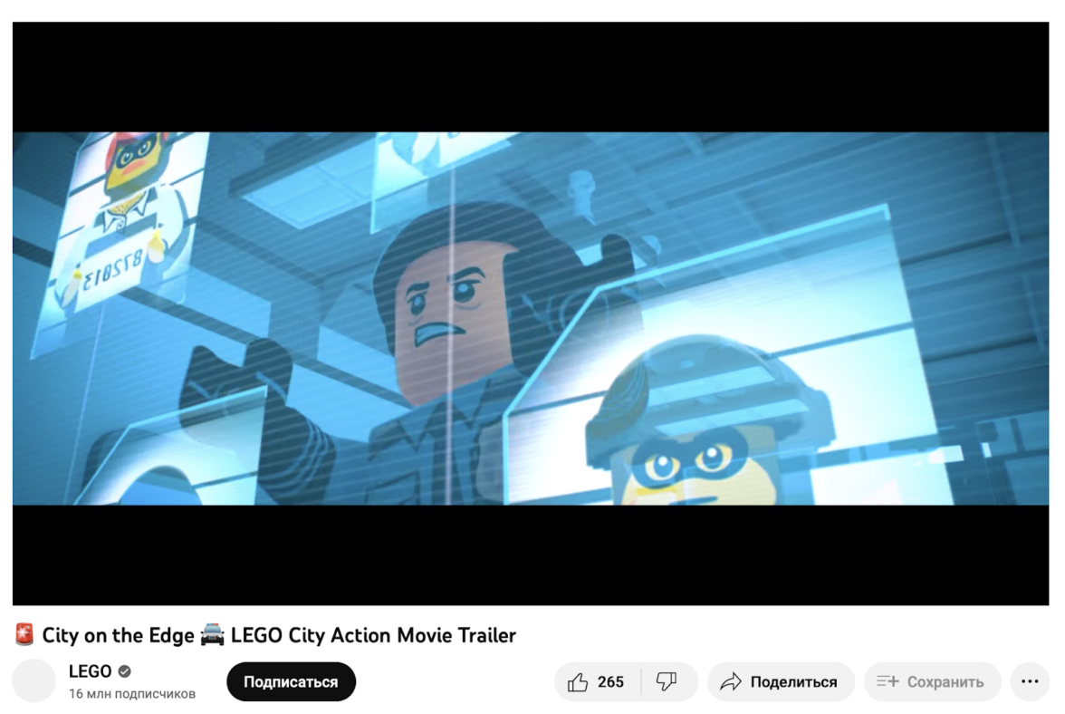 На своём официальном англоязычном Youtube-канале бренд выкладывает не только обзоры на конструкторы, но целые анимационные сериалы с LEGO-человечками. Так компания создаёт сценарии для игр, которые повторяют главные потребители — дети.