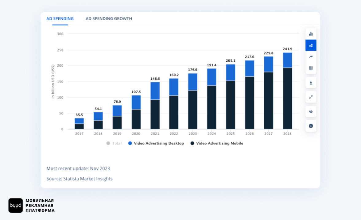Будущее за видеорекламой, и статистика это подтверждает. Ожидается, что к2024 году расходы на видеорекламу достигнут $191,3 млрд, а к 2028 году на мобильную рекламу придется $193,4 млрд.
