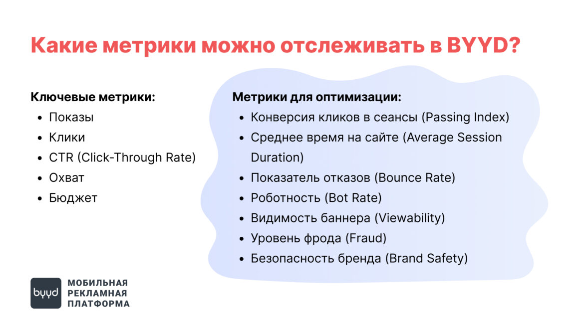 Платформа BYYD обеспечивает высокое качество и прозрачность трафика. Мы используем надежные трекеры и сервисы верификации, такие как Weborama, Adriver и Double Verify, чтобы гарантировать точность данных и эффективность кампаний.