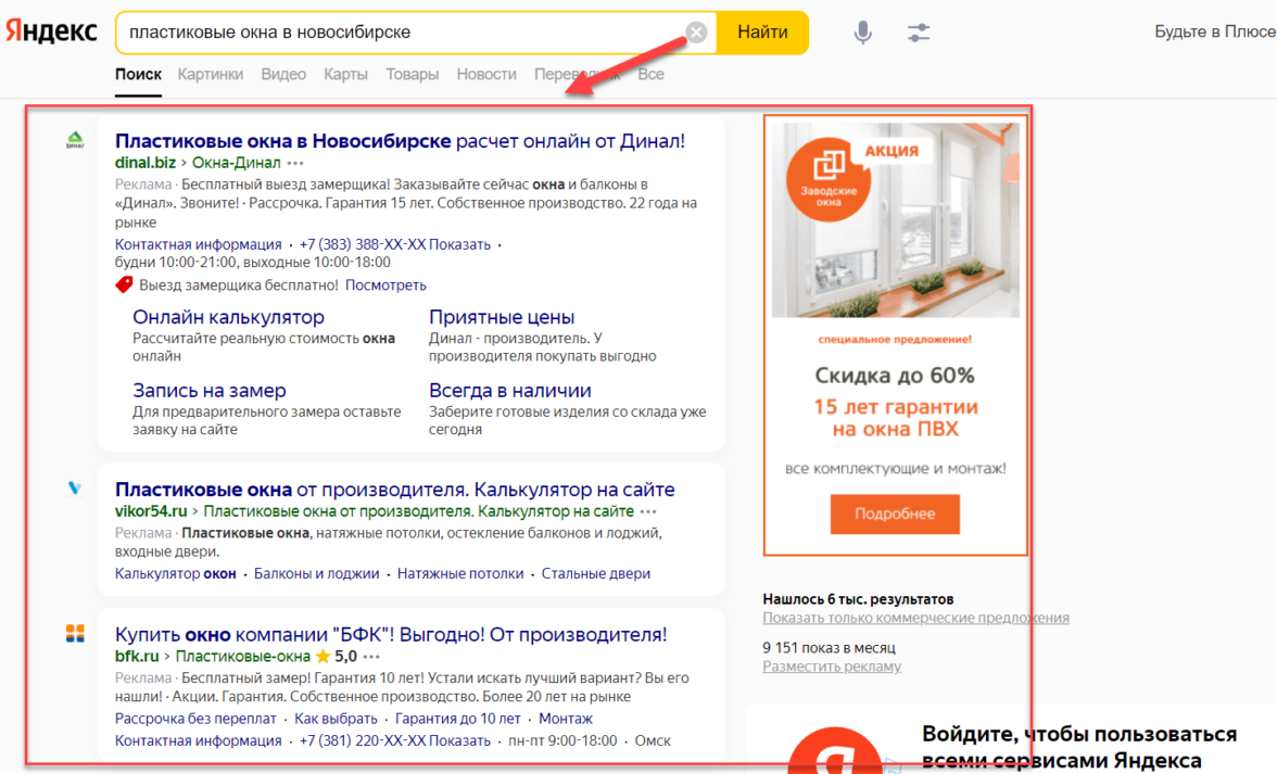 Например, если ввести в «Яндекс» запрос «Пластиковые окна в Новосибирске», то сайты, которые отображаются в верхней части — это рекламные объявления.