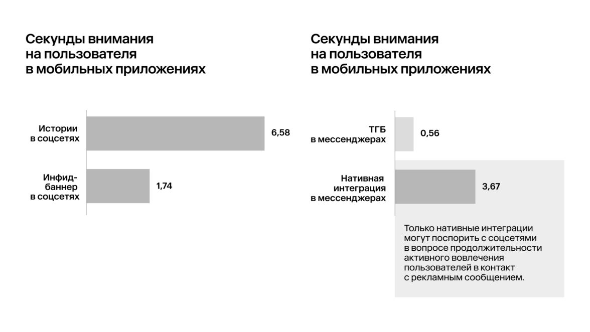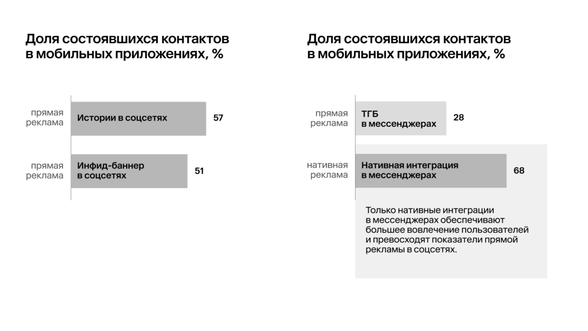 Эксперты Mera сравнили четыре формата, доступные в мобильных приложениях: истории (соцсети), инфид-баннер (соцсети), текстово-графический блок (мессенджеры), нативная интеграция (мессенджеры). Худшие показатели и по доле состоявшихся контактов, и по секундам внимания на пользователя показал текстово-графический блок.