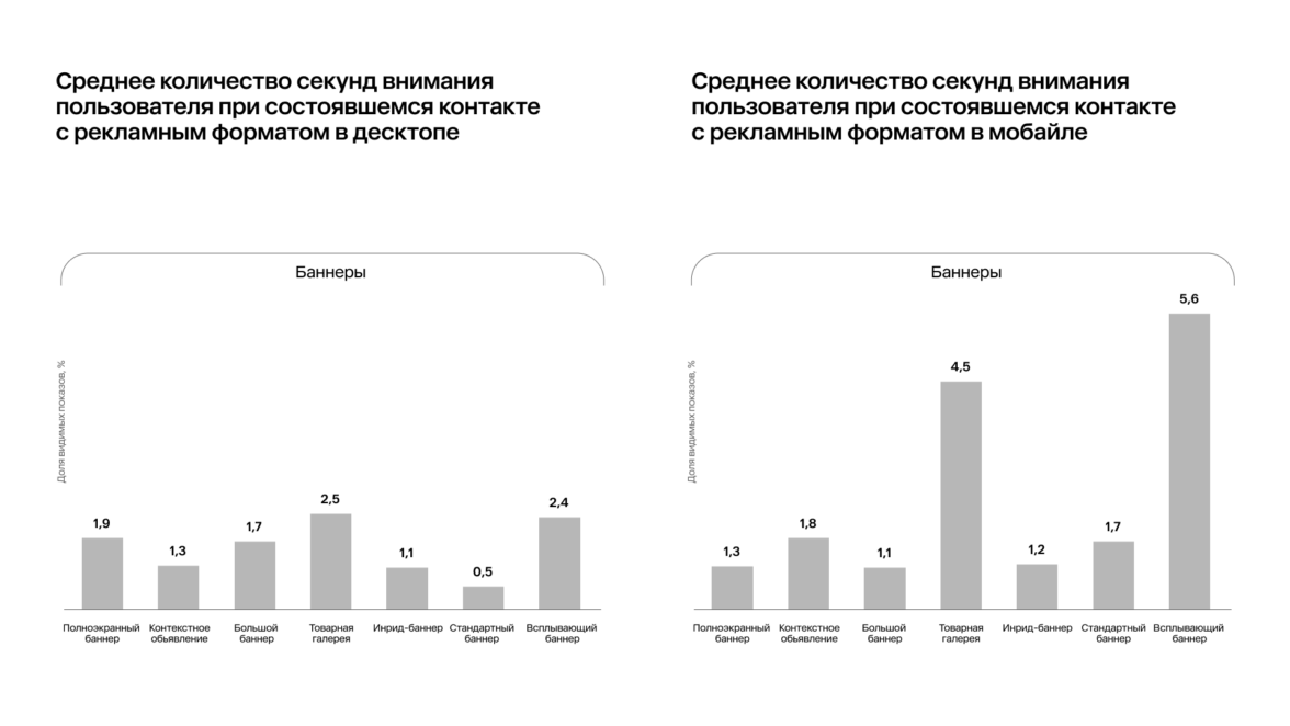 2. Мобильная реклама лидирует по времени активного внимания. Эксперты посчитали, сколько секунд внимания пользователя приходится на каждый формат. В четырех случаях из шести десктоп проигрывает мобайлу: контекст, товарная галерея, инрид-баннер, стандартный баннер, всплывающий баннер. Все перечисленные форматы привлекают больше внимания в мобильной версии. Исключение составили полноэкранный и большой баннеры.
