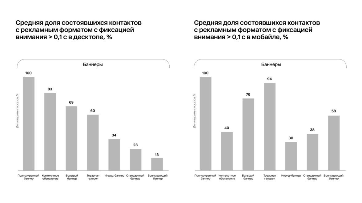 1. Баннерная слепота более выражена в десктопной версии рекламы. В целом мобильная реклама превосходит десктопную по такому параметру, как доля состоявшихся зрительных контактов. Этот показатель на десктопе составил 54%, на мобильных устройствах — 62%.