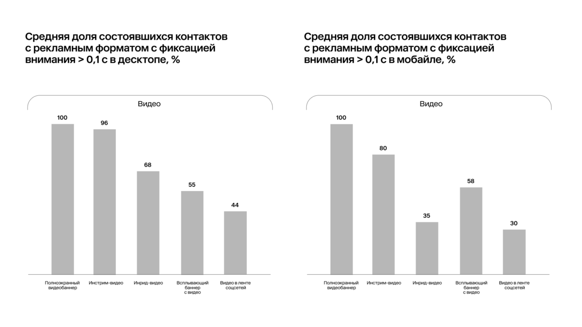 4. In-stream — второй по заметности видеоформат, который уступает только полноэкранным видеобаннерам. Доля состоявшихся контактов у in-stream составляет 96% на десктопе и 80% в мобайле. Высокие показатели связаны с тем, что пользователи уже вовлечены в просмотр видео и с большей вероятностью досмотрят рекламу, встроенную в поток основного контента.