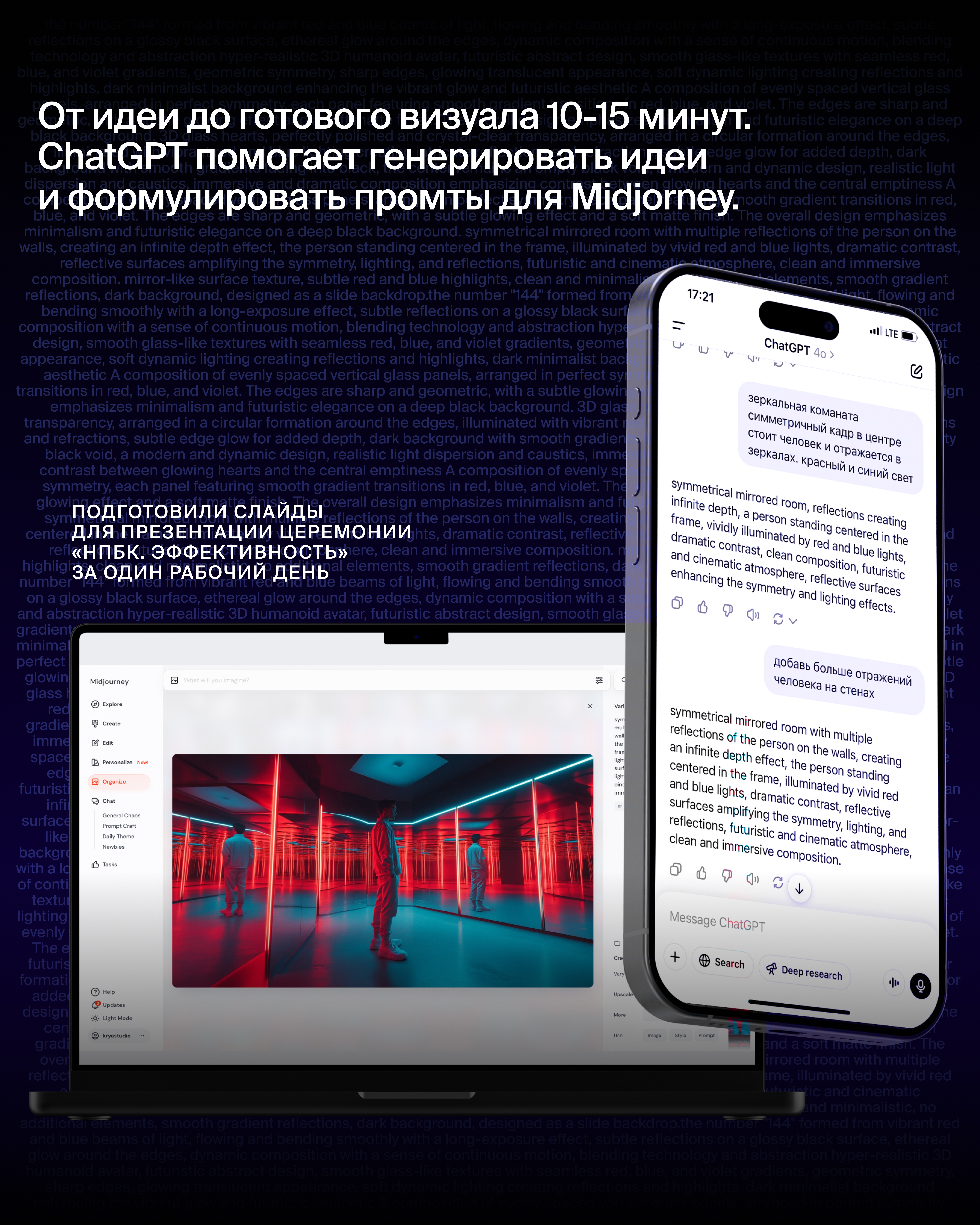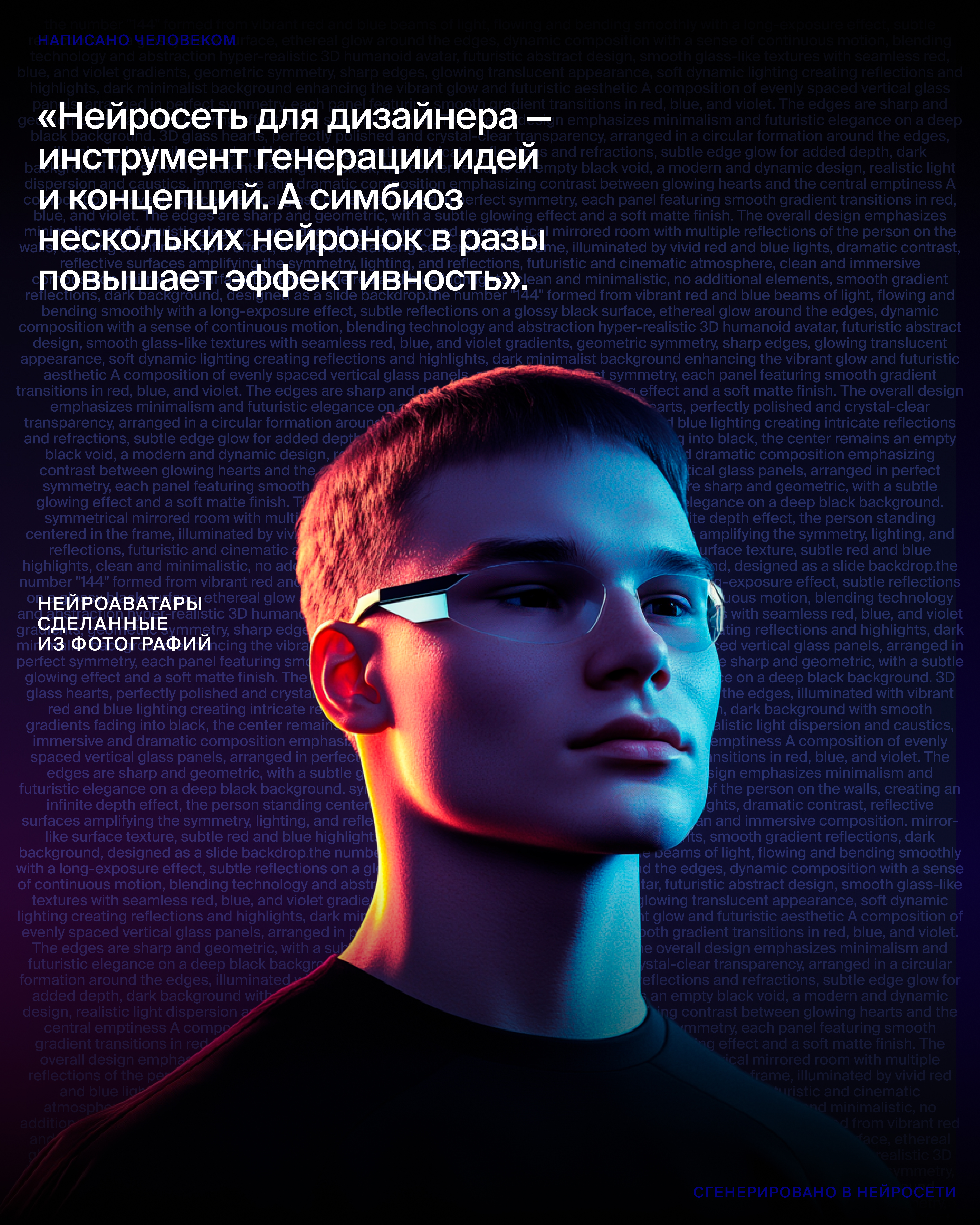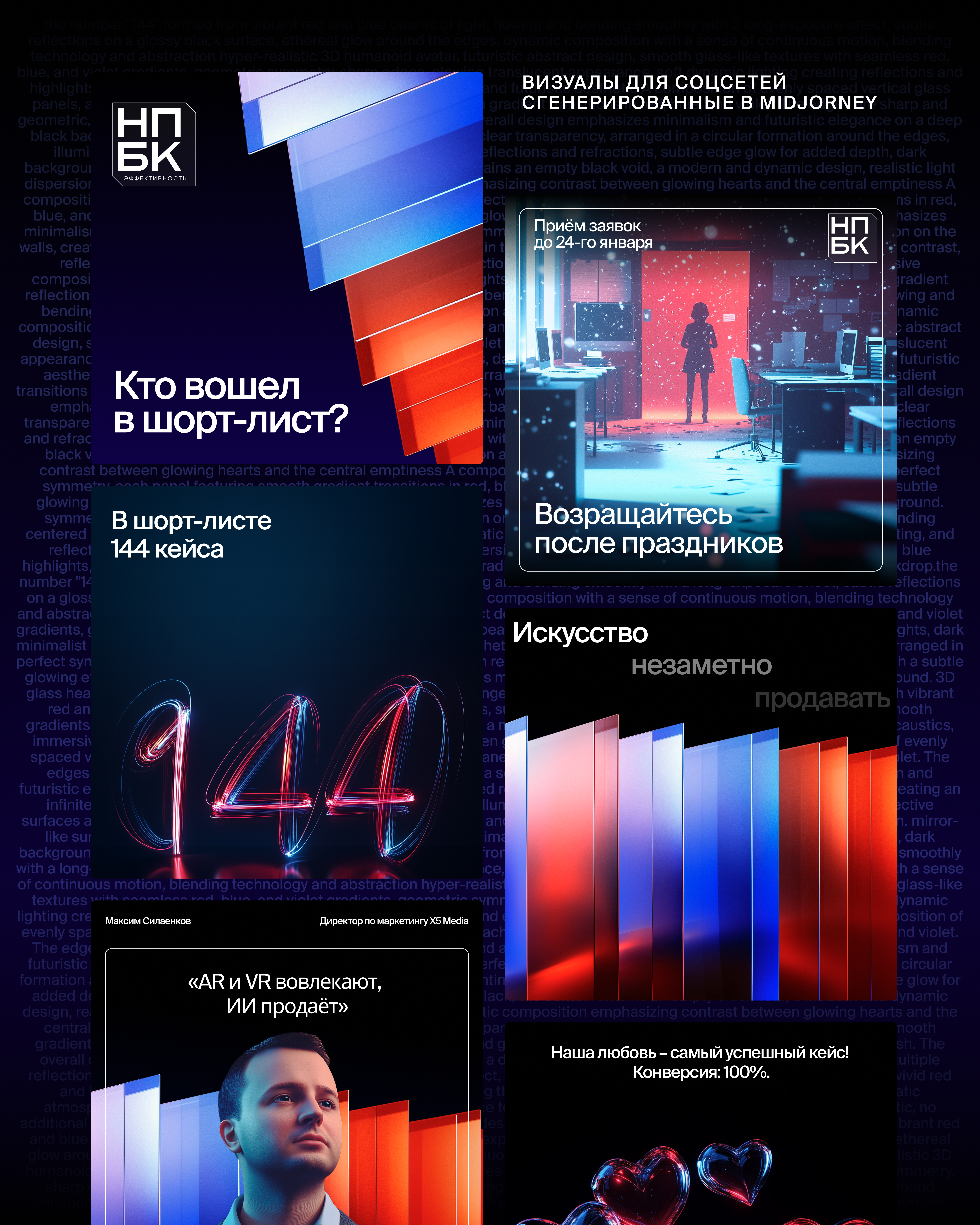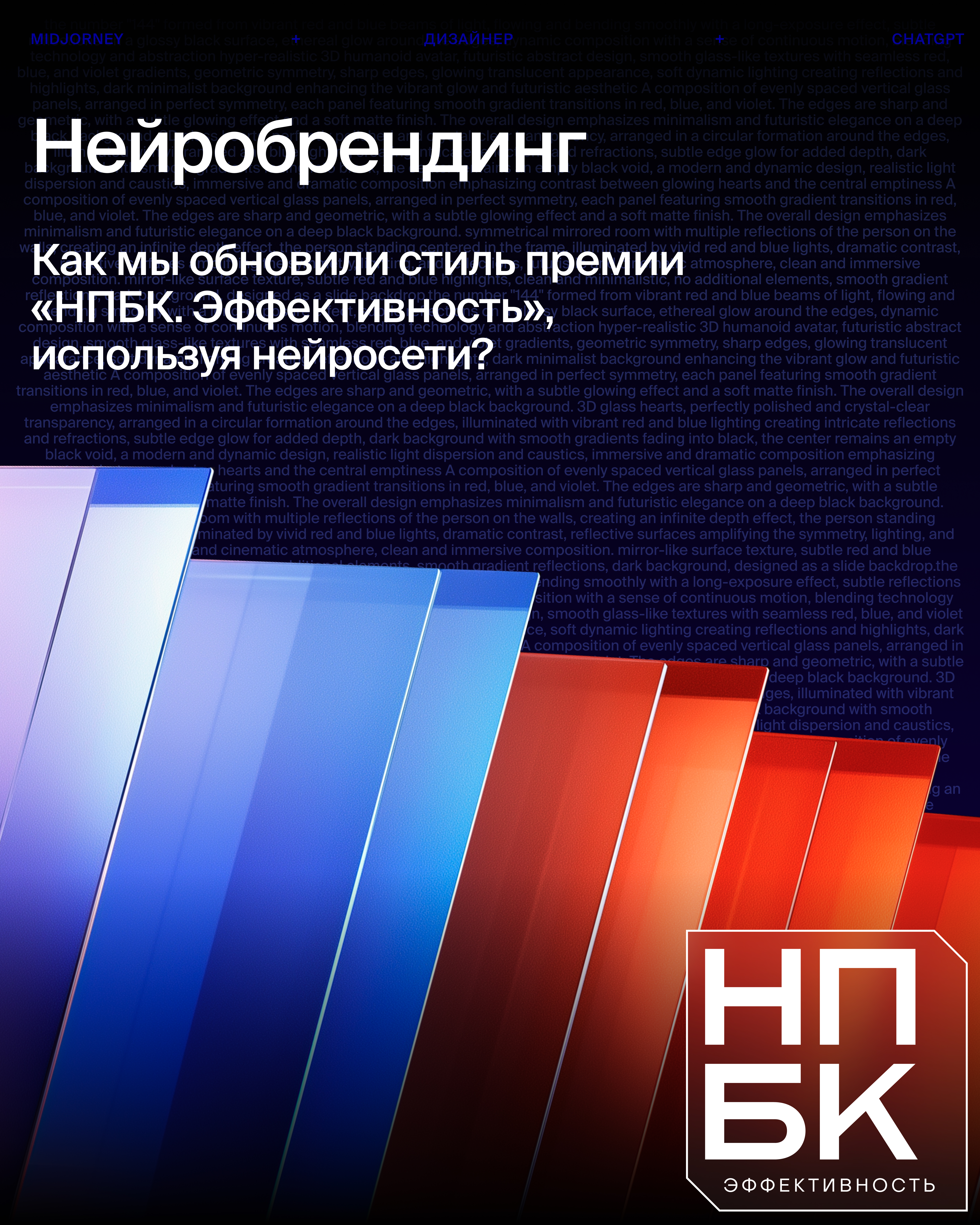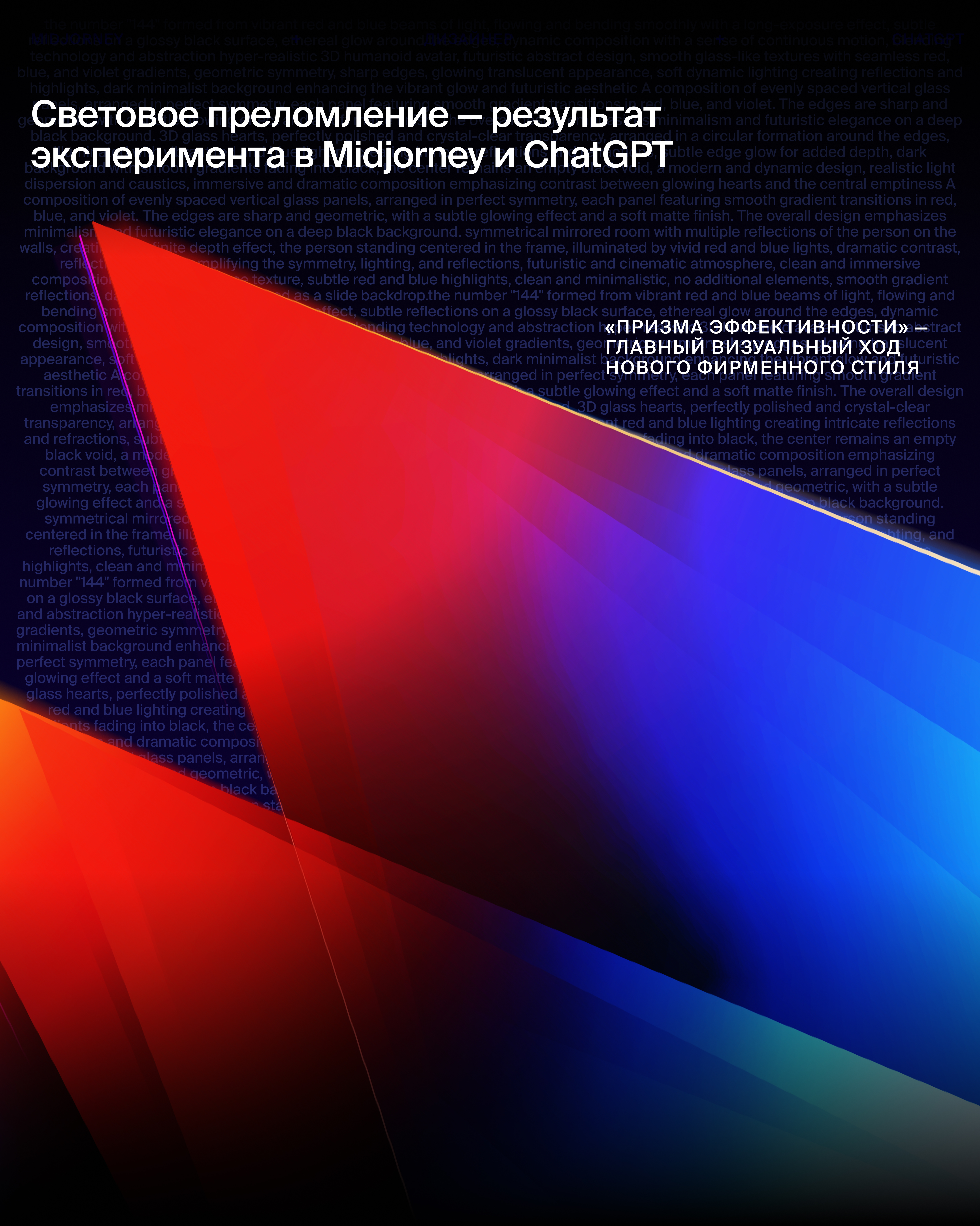 Новый фирменный стиль с динамичной градиентной призмой от красного к синему символизирует многогранность маркетинга. AI-генерация помогла создать уникальные формы, текстуры и световые эффекты, которые легли в основу оформления.