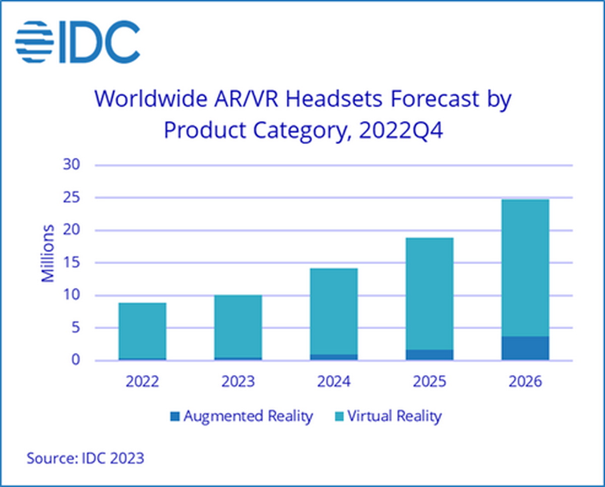 По мнению аналитиков IDC, рынок гарнитур дополненной и виртуальной реальности (AR/VR) в 2023 году будет расти медленнее, чем ожидалось. Компания прогнозирует, что в этом году по всему миру будет отгружено 10,1 млн гарнитур, что лишь на 14% больше, чем в 2022 году. Тем не менее предполагаемый совокупный годовой темп роста (CAGR) в 32,6% на 2023–2027 годы указывает на то, что спрос может вырасти в ближайшие несколько лет.