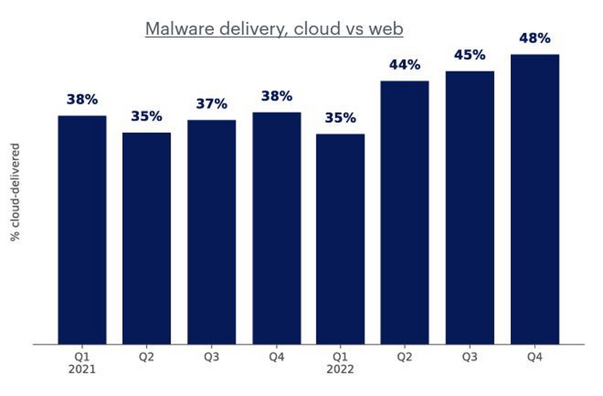 Популярность облачных сервисов ускорила темпы роста распространения через них вредоносного ПО. К началу 2021 года их доля в деле заражения клиентских устройств достигла 38%, а концу 2022 года выросла до 48%.