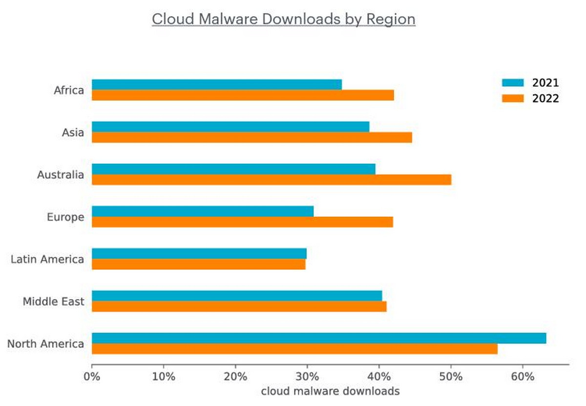 Максимальное распространение вирусов через облачные сервисы происходит в США. Несмотря на то, что в 2022 году количество загруженного таким путем вредоносного ПО в регионе несколько снизилось, Северная Америка по этому показателю лидирует. Меньше всего вирусов в облаках ловят в Европе. Но тут наблюдается обратная ситуация — после пандемии доля заражений, полученных через облако, выросла.