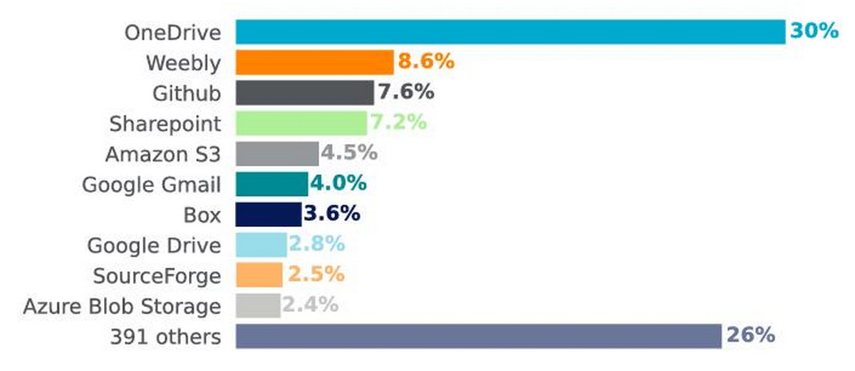 Но в невольном распространении компьютерных вирусов участвуют и все другие популярные облачные сервисы. Подцепить троянскую программу или что-то подобное можно с SharePoint (7,2%), с Amazon S3 (4.5%), с Google Drive (2,8%) или с практически любого ресурса, имеющего функционал хранения и передачи файлов от пользователя к пользователю.