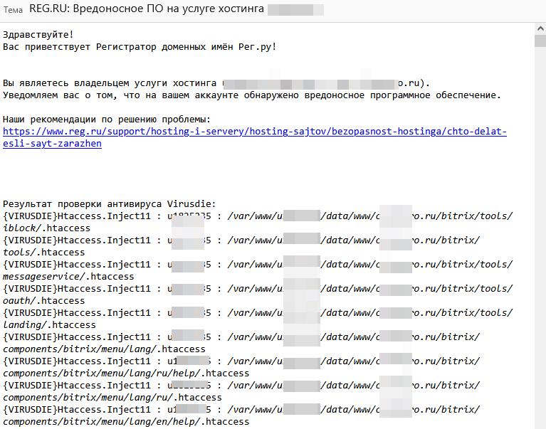 Ваш хостер прислал письмо об обнаружении аномальной активности исходящего трафика или почтовых рассылок с угрозой приостановить функцию отправки почты, либо сообщил об уязвимостях с примерами зараженных файлов.