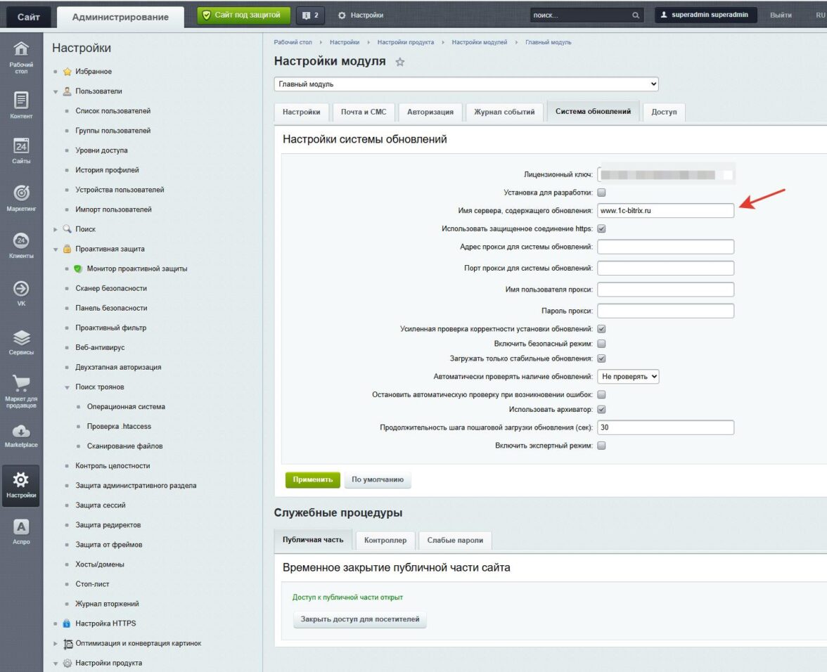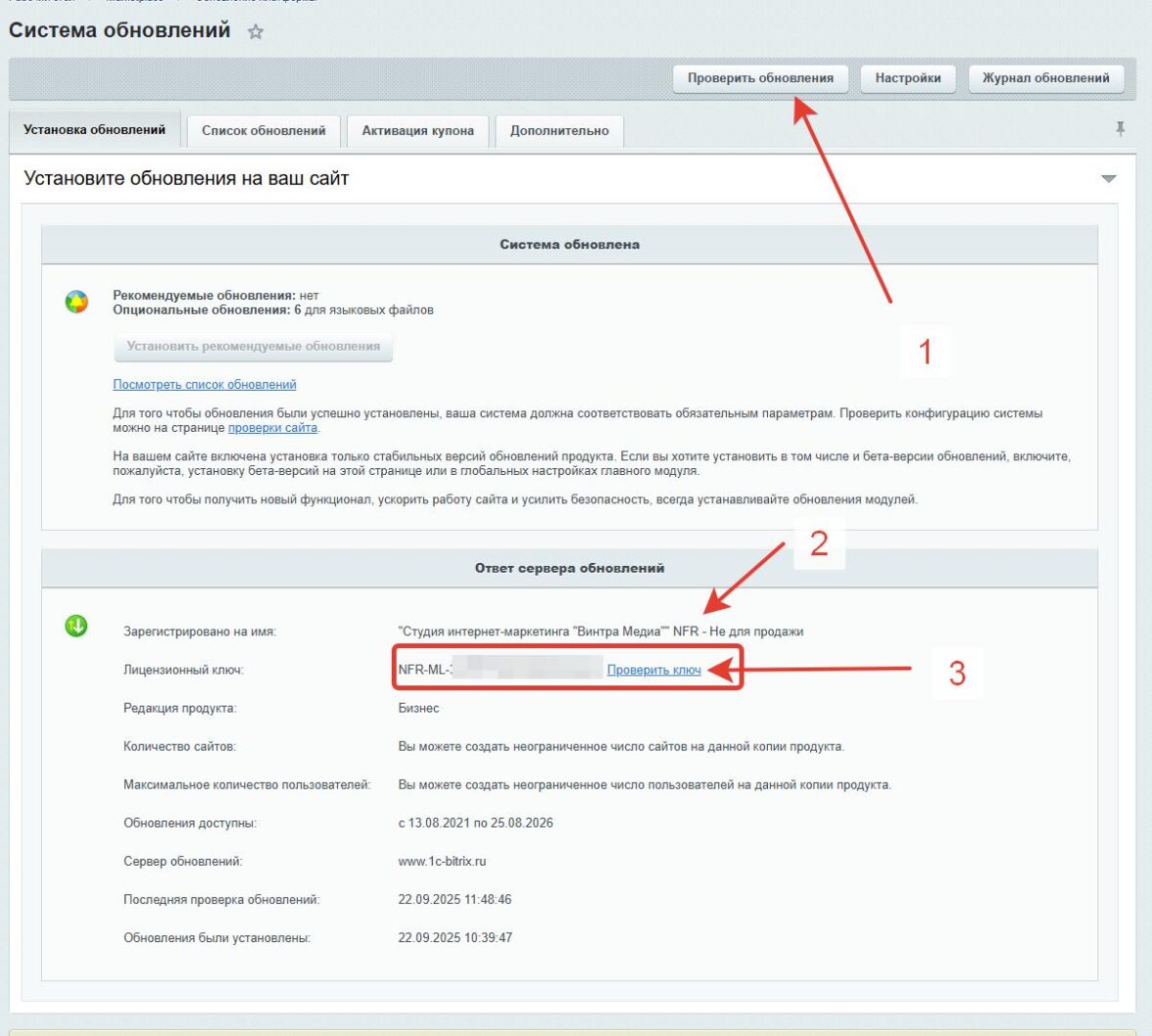 Здесь жмем «Проверить обновления» (п. 1). Если видим, что лицензия и ключ (п. 2) показываются, но период получения обновлений окончился — значит, всё в порядке. Если же видим ошибку и вместо ключа — что-то иное, то, скорее всего, неверен адрес сервера для получения обновлений. Внесите изменения на странице настроек главного модуля (*ваш_домен*/bitrix/admin/settings.php), как показано на скриншоте.