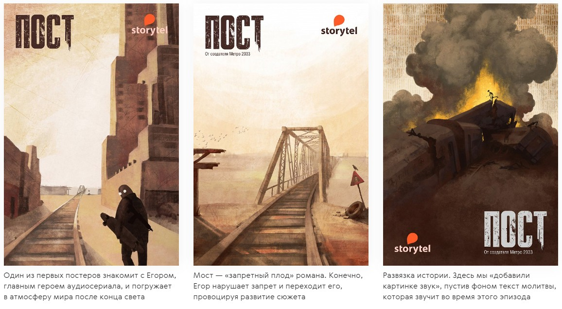 Это первый в России крупный ориджинал, который мы делали. Нам нужно было сделать что-то классное, чего на российском рынке ещё не было. Ребята из IT-Agency поверили в нашу идею, включились, и получилась большая история на весь мир. Аудиосериал дал читателю звук и историю, а вся картинка, которую представляют люди, когда слушают «Пост» — зависит от воображения и визуала. Как художник нарисует этот мир, так его и будут представлять. Визуальное восприятие мира «Поста” и создали для нас в агентстве.