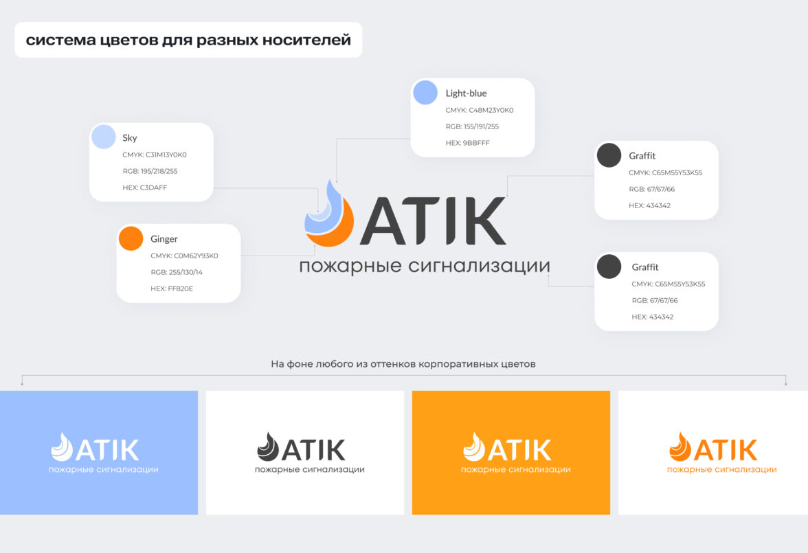 Цветовая палитра фирменного стиля построена на контрасте и дополняющих друг друга значениях. в основе «сигнальные» оттенки пламенного оранжевого — метафорически они связаны с огнем и функциями сигнализации. Им противопоставлены охлаждающие небесно-голубые — они про ощущение контроля и связь с водой.