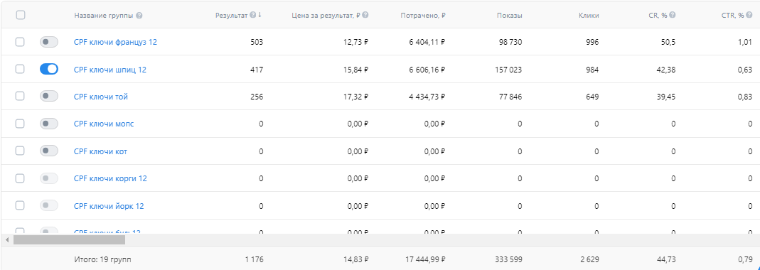 Каждую неделю проводился аудит связок по ключевым метрикам — CPF, CTR и ER. Сильные группы получали увеличение бюджета, слабые — снижение, что позволило поддерживать эффективность кампаний на высоком уровне.