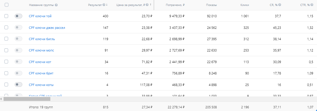 Собаки: от тойтерьера и мопса до корги и шпица — каждому сегменту мы создали уникальные креативы с персонализированными ключевыми словами. Результат: CTR вырос на 23%.
